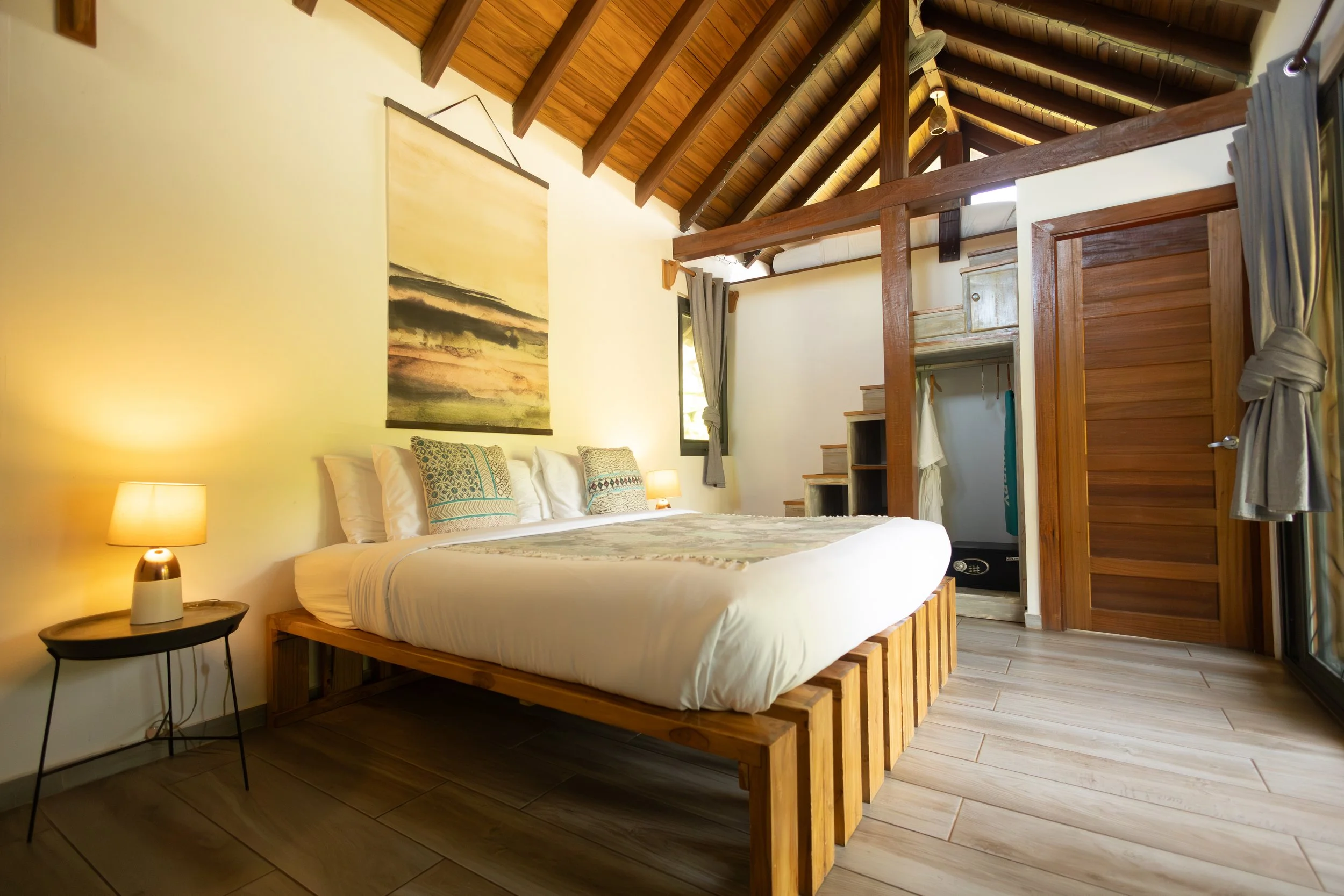 Slightly smaller than our beachfronts, the garden casitas feature an open loft with a double (full) bed. These lofts are best for kids aged 4+, but cribs can be added for younger children. A great option for adventurous families or those traveling with siblings of mixed ages.