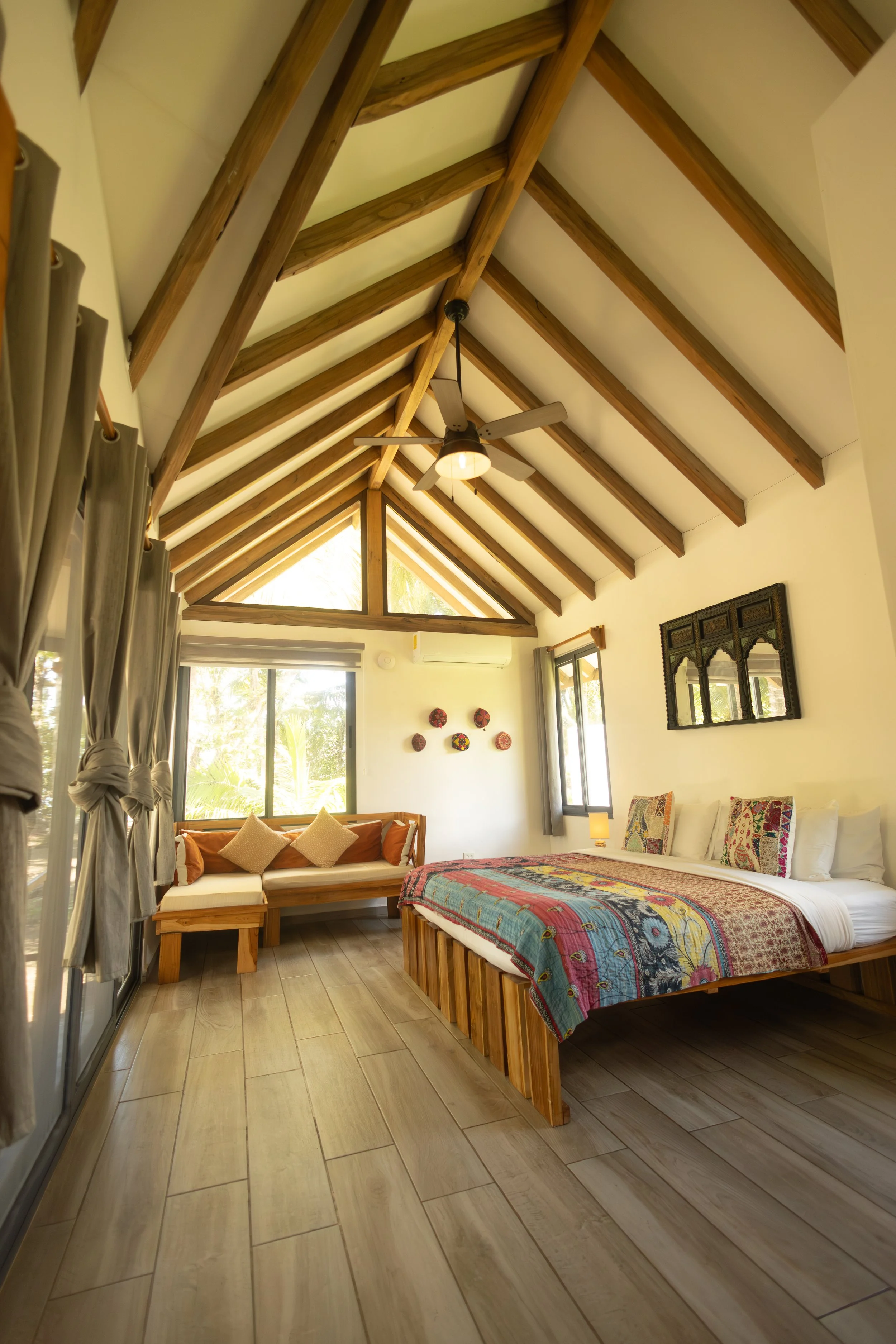 Features and Amenities: Jungle Views - Interior 409 sq ft | Covered Exterior 312 sq ft. | Built-in ‘catamaran style’ hammock | King bed | Air conditioning | Complete bath products | Hairdryer | Minifridge | Kettle and French Press | Complimentary coffee & tea & milk | Beach towels | Complimentary Wi-Fi | Safety Deposit Box | Daily Housekeeping | Ceiling fans throughout | Private furnished patio